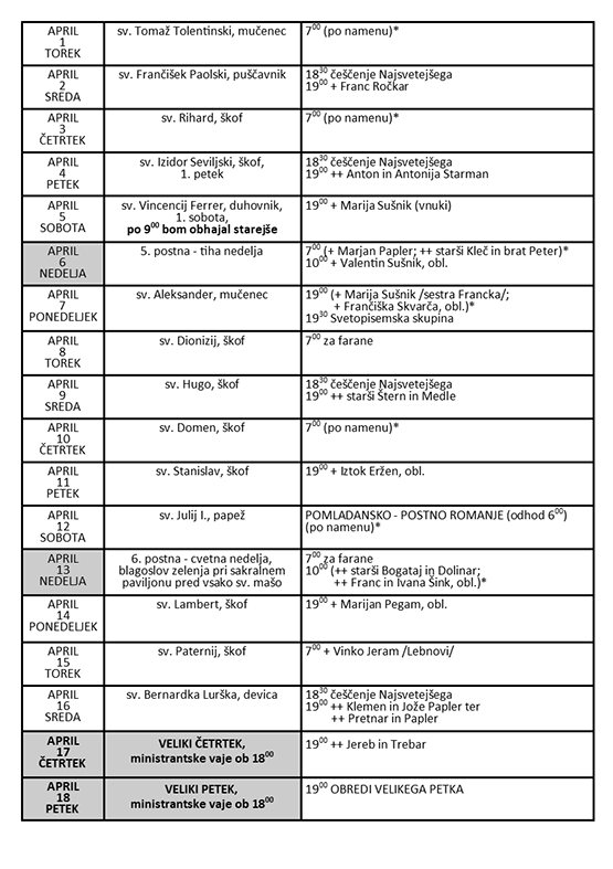 16.12., sv. Ado, škof; BD (božična devetdnevnica); med 17:30 in 19:30 možnost za spoved za vse – na voljo tuj spovednik; ob 19:00 (vsi veroukarji pridejo ob 18:45 v cerkev – prisotnost bomo preverili) ++ Marija in Slavko Sušnik, obl. ter ++ Tone in Neža Janc, obl.;